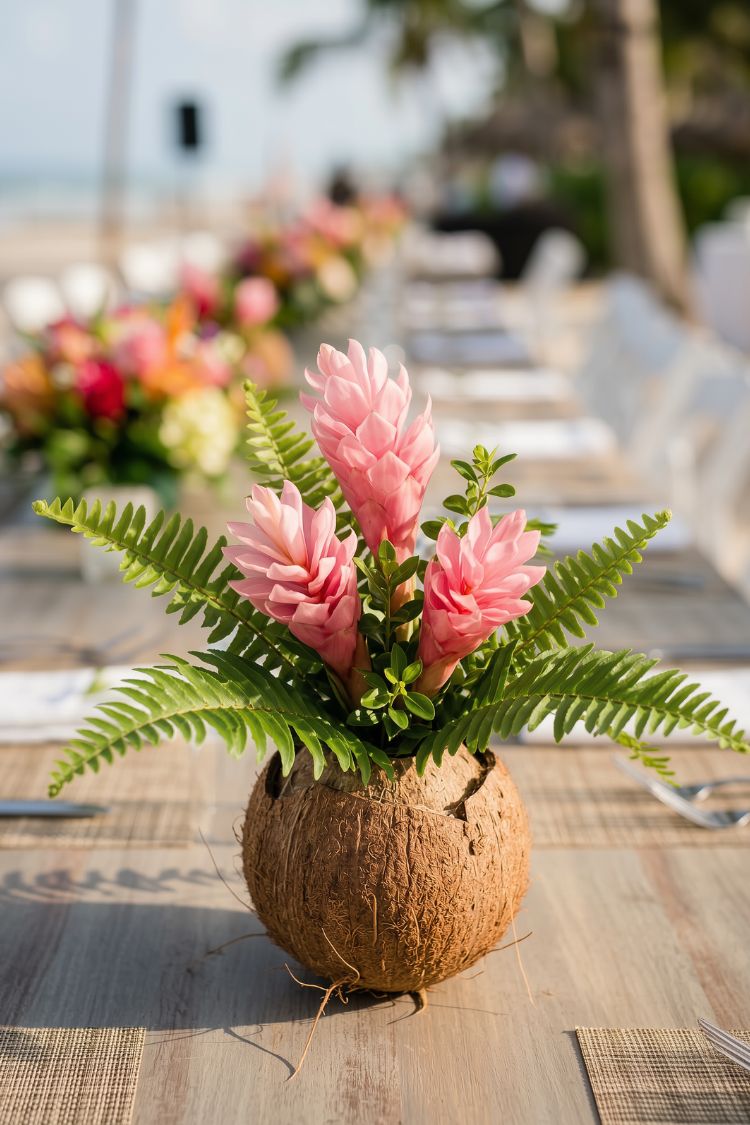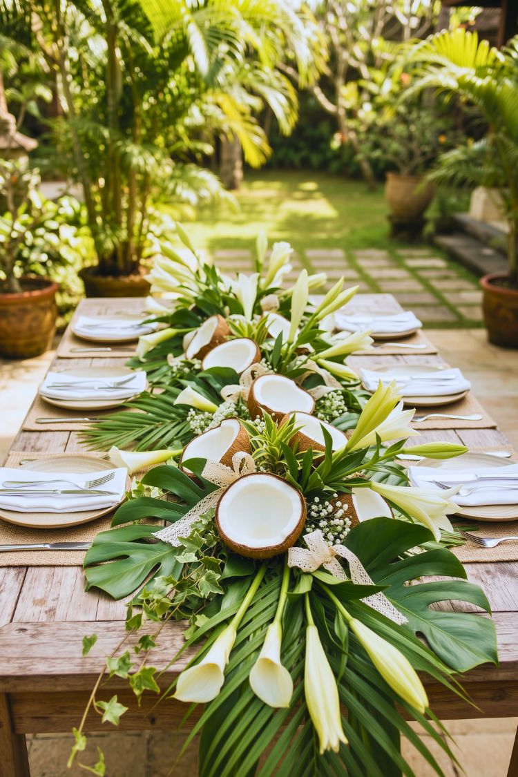 The coconuts are a fun touch that instantly give the table a tropical feel without needing bright colors. I also like how low everything sits, so the table still feels open and easy for conversation.