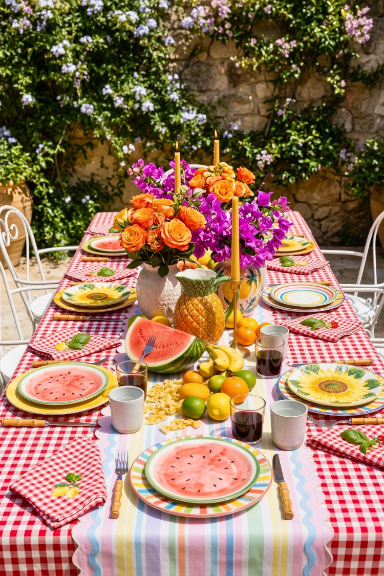 This one leans fully into that cheerful summer picnic energy. The red gingham tablecloth already sets the tone, but the fruit scattered down the middle really brings the whole table to life. Watermelon, lemons, bananas, even that pineapple pitcher make it feel abundant instead of overly styled. The bright flowers add height without taking over the table, and those playful watermelon plates make the whole setting feel lighthearted. I like how nothing is too precious here. Honestly the fruit centerpiece is the trick I’d borrow because it adds color, texture, and something guests can actually snack on later.