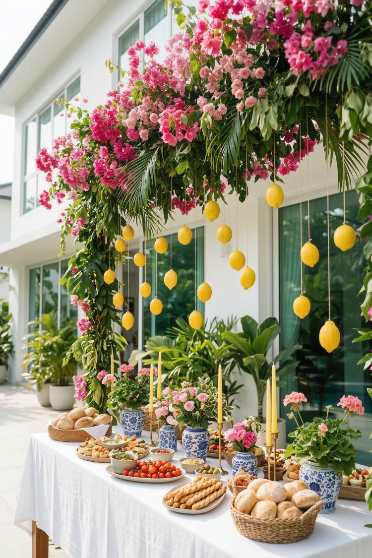 I had to look twice at this one because the lemons hanging from the floral arch are such an unexpected detail. Instead of just greenery and flowers, those bright yellow lemons add this playful pop of color that instantly feels summery. I’d absolutely steal the idea of hanging fruit from an arrangement like this because it turns a normal floral arch into something much more memorable.