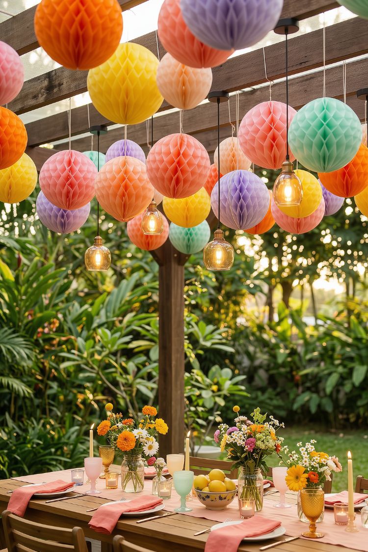 The first thing I noticed here wasn’t the table at all, it was the ceiling of colorful lanterns hanging from the pergola. All those soft pastel shades make the whole setup feel playful and a little dreamy, especially mixed with the warm glow from the bulbs. Down on the table things stay simple with small flower jars, candles, and a bowl of lemons, which keeps everything from feeling overcrowded