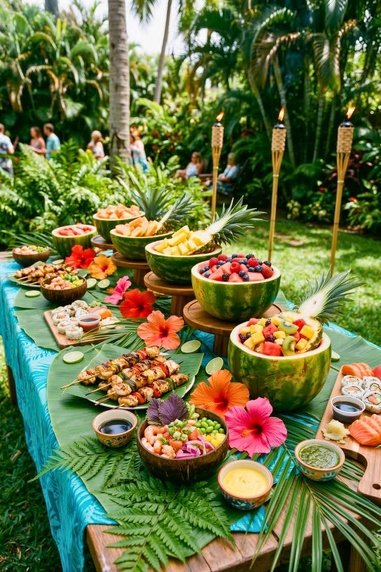 What caught my eye here is how the food itself becomes the centerpiece. Watermelons are hollowed out and filled with colorful fruit, sitting on small stands so everything feels layered and abundant. Big tropical leaves and bright hibiscus flowers spread across the table add that lush island vibe. It almost feels like a mini tropical market display, which makes the whole setup look festive and inviting instead of overly styled.