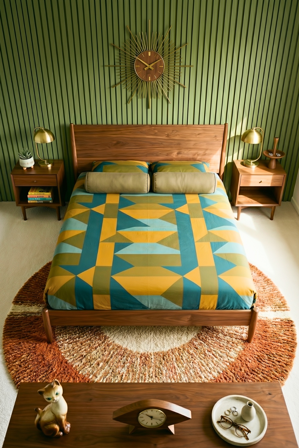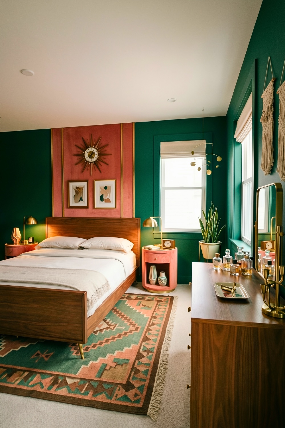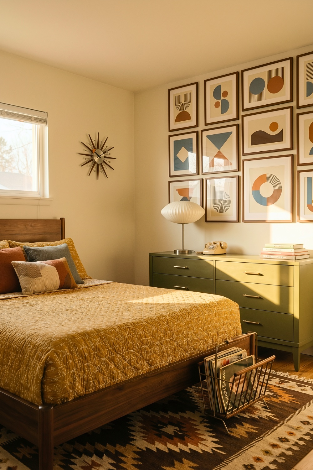 This next space feels like a playful, fresh take on the 70s style by mixing retro shapes with a boho color set. I’m drawn to how the nightstands and dresser work together to create a cohesive theme. It’s a smart hacks-based approach to adding character without making the room feel chaotic.