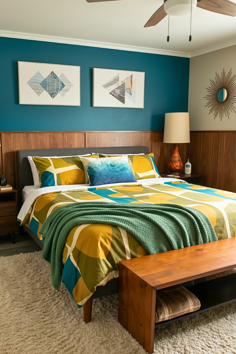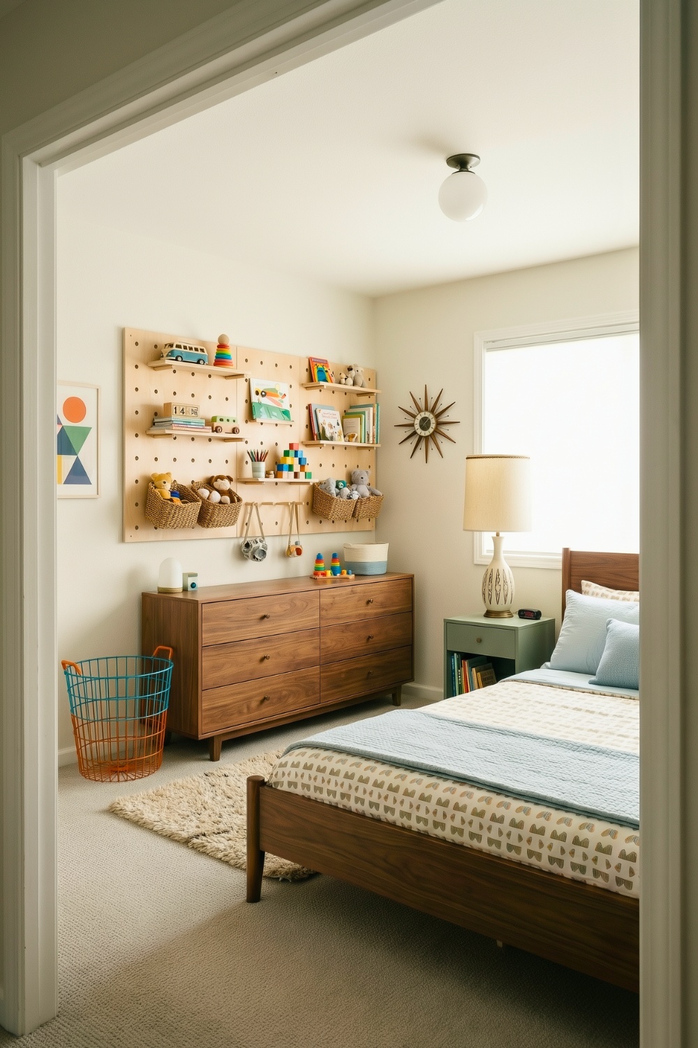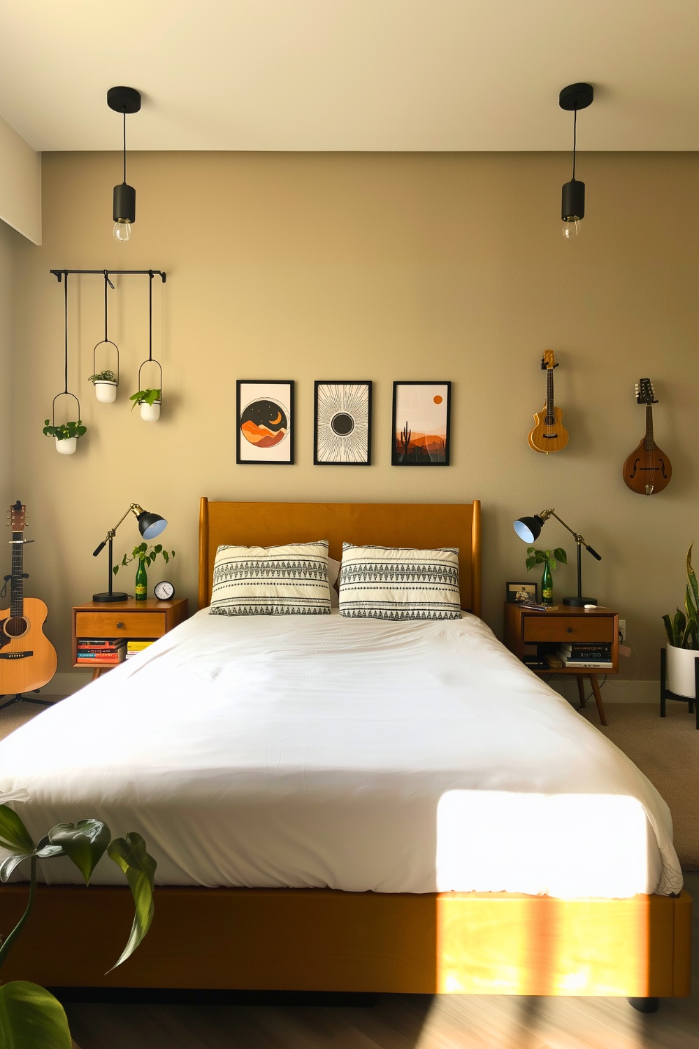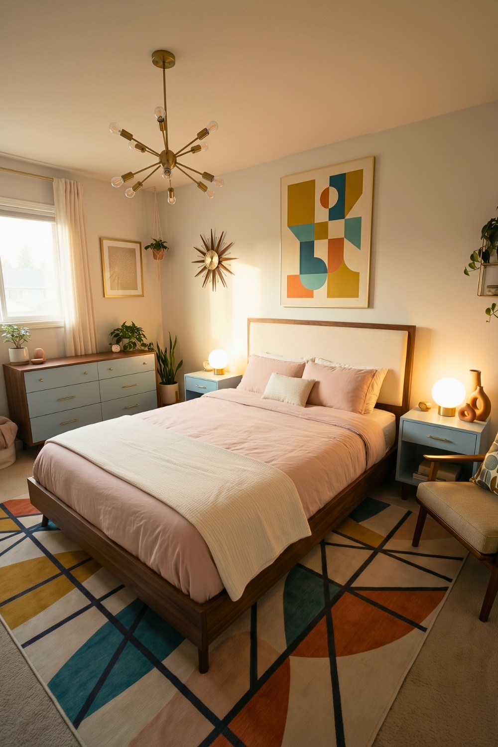 This next space feels like a playful, fresh take on the 70s style by mixing retro shapes with a boho color set. I’m drawn to how the nightstands and dresser work together to create a cohesive theme. It’s a smart hacks-based approach to adding character without making the room feel chaotic.
