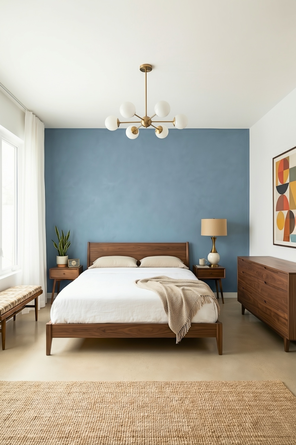 Sometimes, keeping it simple is the best move, which is why I like this soft blue wall as a backdrop for minimalist furniture. A clean-lined bed, a simple dresser, and matching nightstands solve the clutter problem instantly. I recommend this style of interior for any room that needs to be a peaceful retreat.
