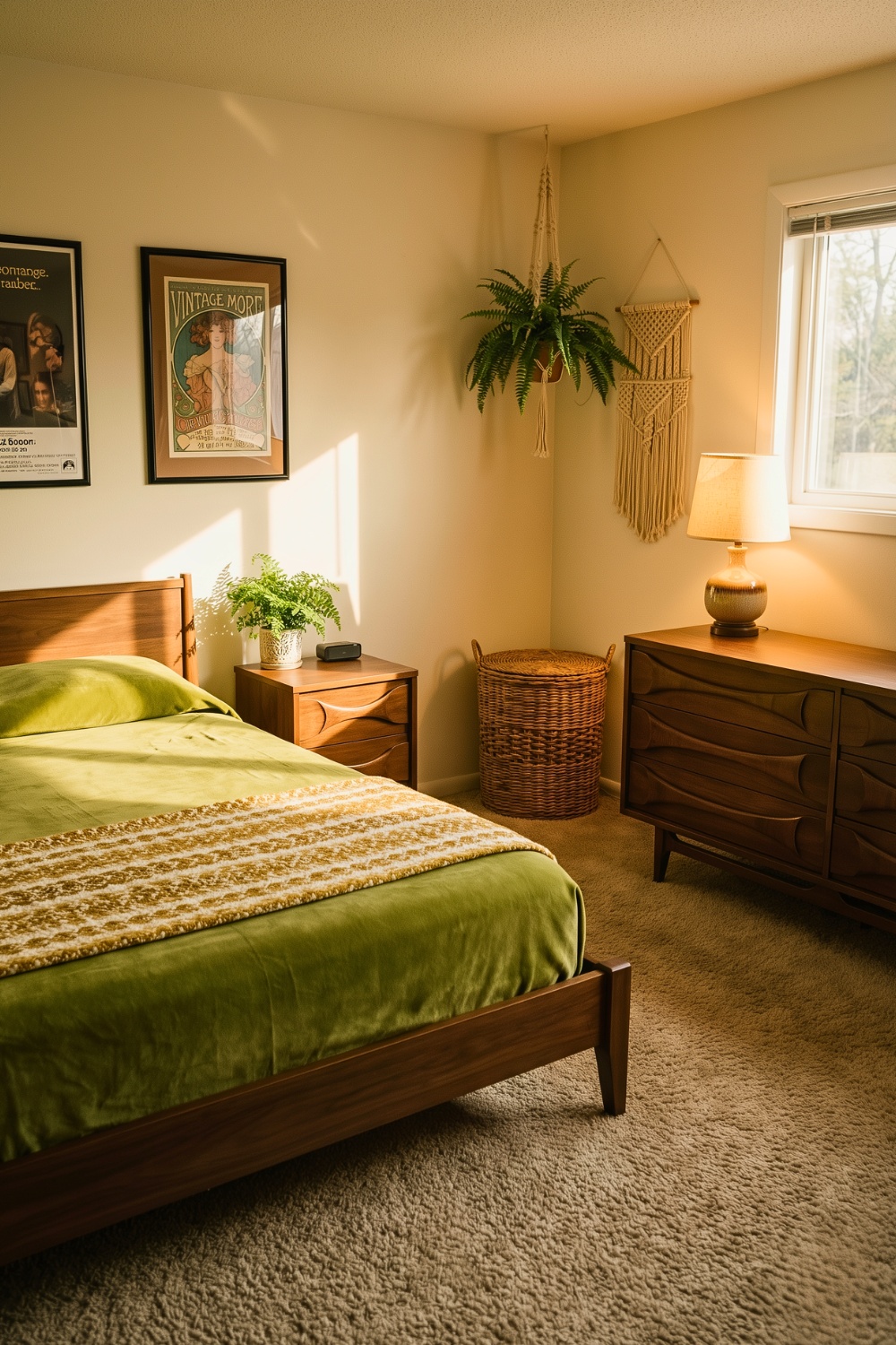 I really like how retro art can define a theme while keeping the actual furniture very practical. Using a green dresser and warm lighting is a great way to bring in 70s inspiration without making the room feel dated. I think this balance is the secret to a great room.