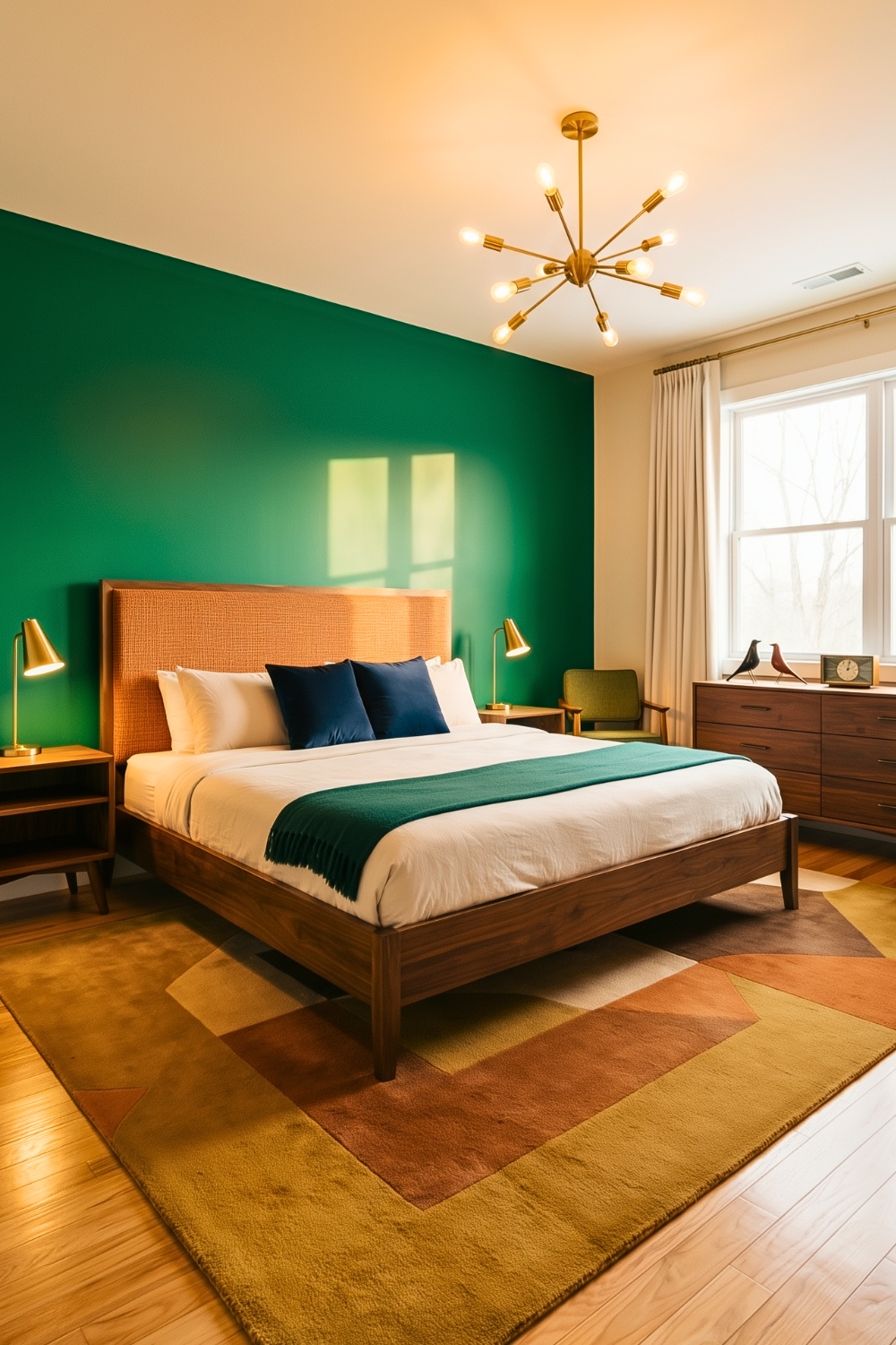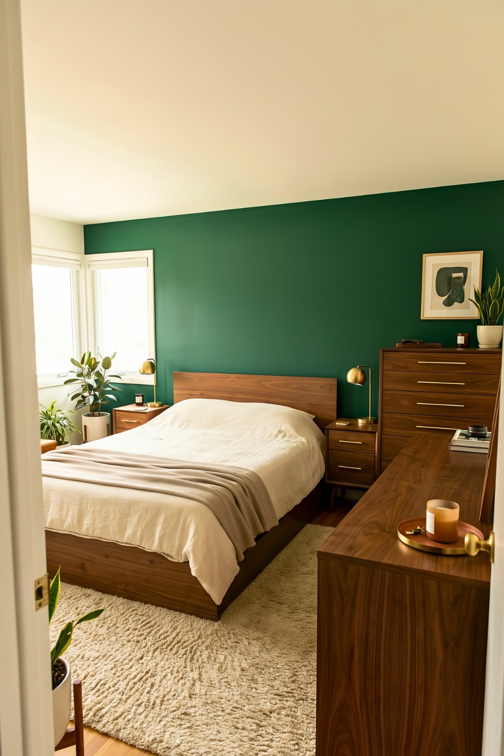 If you’re worried about a dark wall being too much, take a look at this blue-green color choice. It pairs beautifully with a wood bed and a matching dresser to keep things feeling contemporary and fresh. I’d call this a clever style hack for anyone who wants a look that feels both updated and timeless.