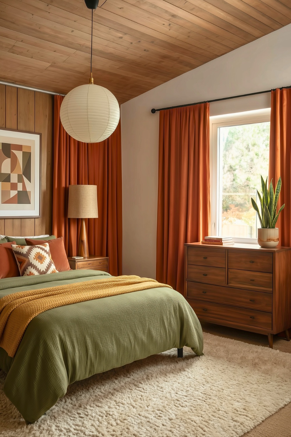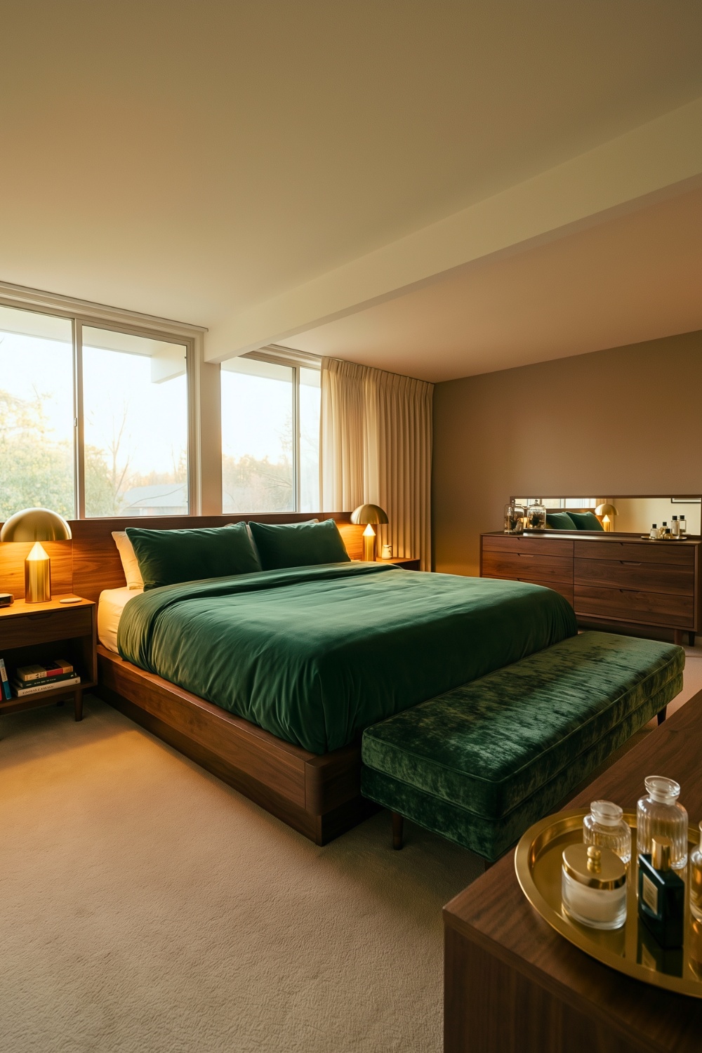 For a more luxury take on the trend, try using rich green fabrics and a long wood dresser to anchor the room. I love how this 70s style influence focuses on quality textures rather than just “stuff.” You’ll find that using retro inspiration this way creates a space that feels grown-up and elegant.