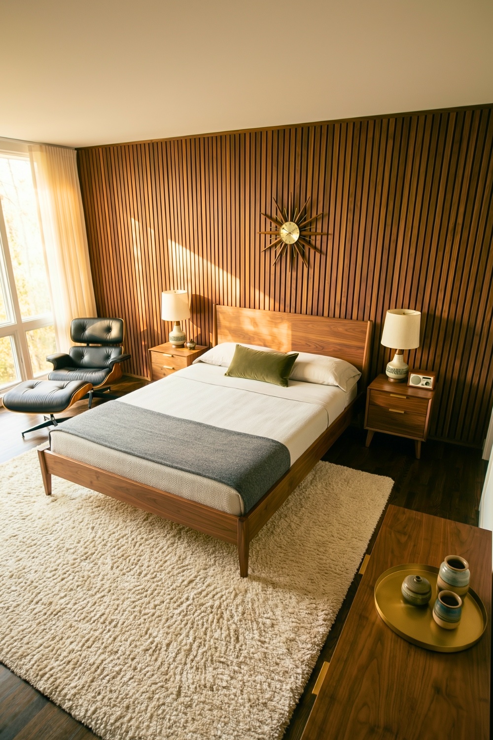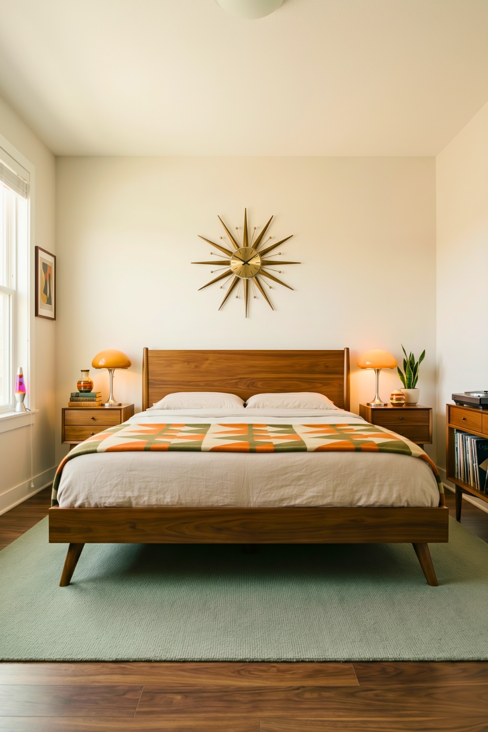 I’m a big fan of the classic look, especially when it includes a minimalist bed and a board-style headboard. Adding a few retro accessories, like a starburst clock, keeps the interior from feeling too plain. Anyone craving a calm, vintage inspiration without any extra fuss will love this setup.