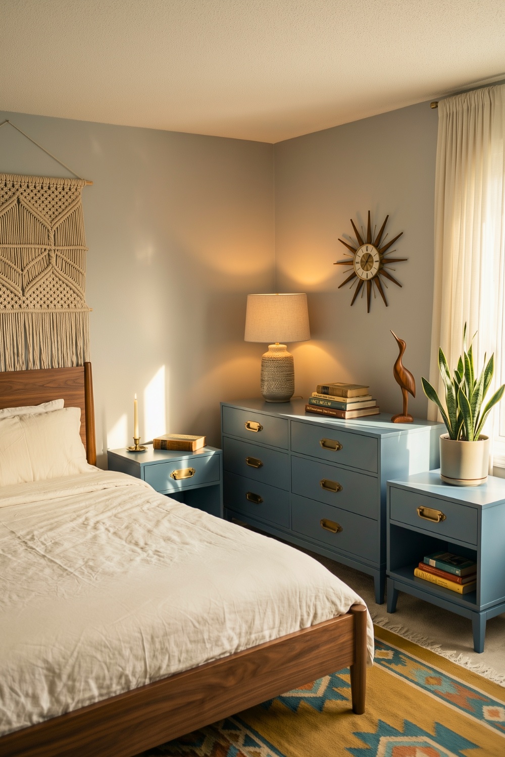 For something a bit more colorful, a blue dresser and nightstand set can really brighten things up. This is lovely inspiration for girls’ rooms or any small space where you want a mix of boho softness and wood-toned structure. The simple wall decor ties it all together nicely.