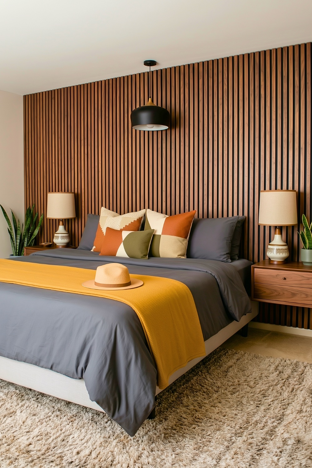 I absolutely love how this first room uses a vertical wood wall board as a statement piece. It instantly brings in that warm 70s style many of us are looking for. By using a minimalist bed frame and matching nightstands, you can get a clean look that still feels full of character, which is a great trick for a small bedroom that needs a touch of luxury interior inspiration.