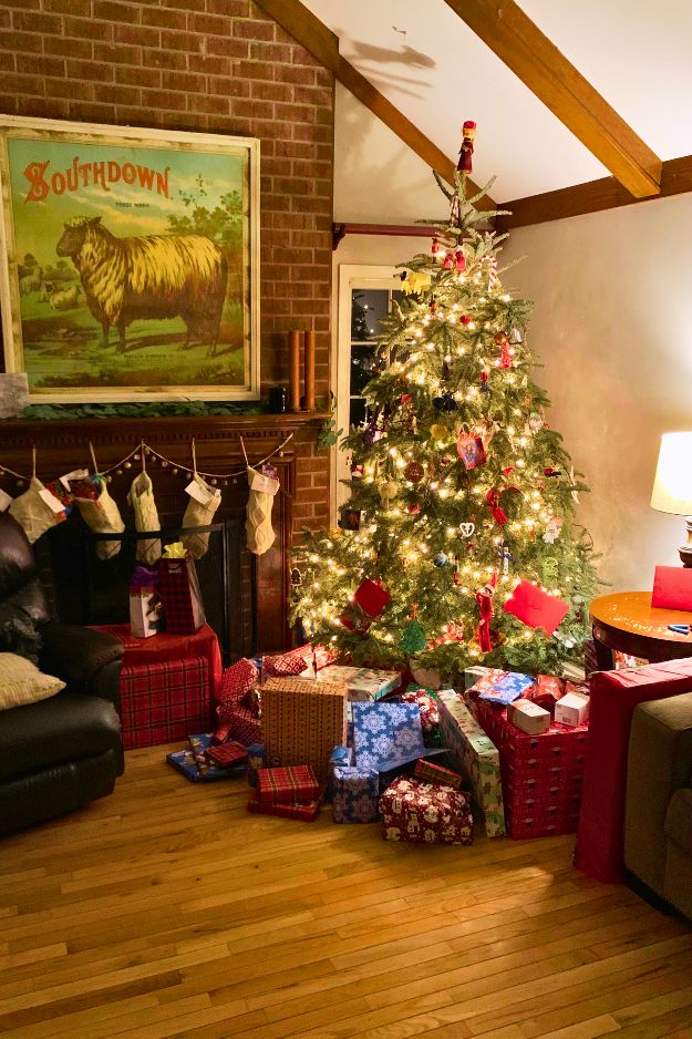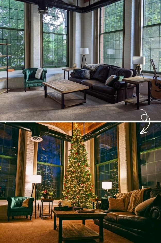 Starting strong with this cozy apartment in New England, I couldn’t get over how perfectly the 12-foot tree fit the scale of the old mill space. The brick walls and giant windows already set the mood, but it’s the way the decor was kept simple that really impressed me.