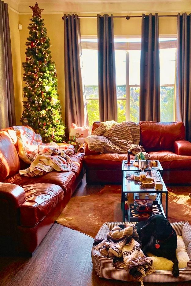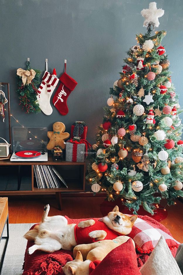 I love everything about this living room, the doggo sleeping on the couch, the glowing tree, even the simple gray walls. The fuzzy star topper and gingerbread make it extra cozy. You can tell it’s Christmas season when Mariah Carey is playing somewhere in the background, and here it’s literally on the record player.
