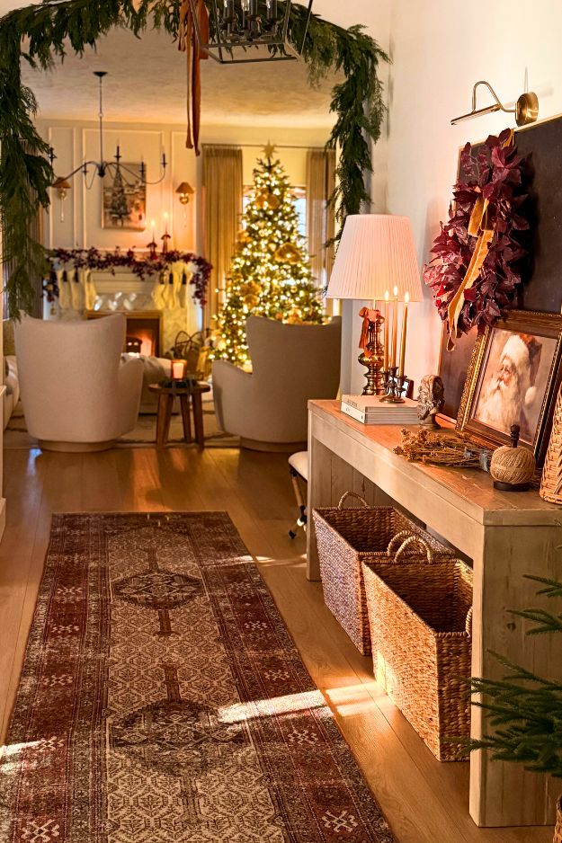 mtimbuck2’s living room and entryway is such a dream. The garland over the archway is a clever mix of faux pines, so it looks full and natural, and they used heavy-duty sticky hooks to keep it in place. The antique Turkish rug, vintage-framed Santa, and those baskets underneath the console add just the right balance of charm and function.