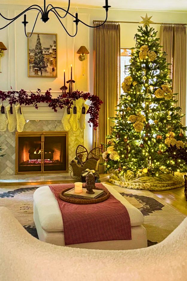 And then there’s the Christmas tree, decorated with hydrangeas, which I’ve honestly never seen before. It’s unexpected, but it makes the whole living room feel even cozier.
