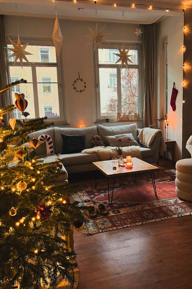 I love how that lantern fits the whole aesthetic so perfectly, it gives off this soft, warm glow that ties the tree and the rest of the room together. It feels so classically German Christmas, but in a really understated, cozy way. The stars are really popular in Germany and Scandinavia, so you can often find them at IKEA or on Amazon. Credit goes to arschkroete2