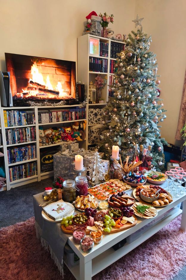 The party setup here is such a goal, it might not be grand or polished, but it nails that cozy, welcoming vibe. A glowing tree in the corner, shelves stacked with books and little quirky touches, and a table loaded with Scotch eggs and festive snacks make it feel like the kind of gathering where you can just relax, eat too much, and laugh with friends.