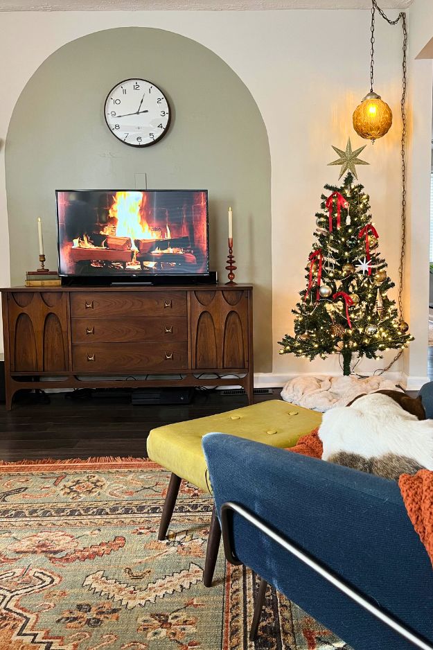 u/ezermuse’s rental living room proves you don’t need a full remodel to make a space feel special for the holidays. The “arch” that first caught my eye is actually painted (Farrow & Ball’s French Gray). I love how personal this setup feels, the mid-century credenza doubling as a TV stand is a gem from Music City Modern, and that hanging lamp was thrifted off Facebook Marketplace.
