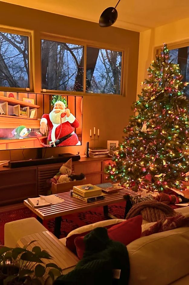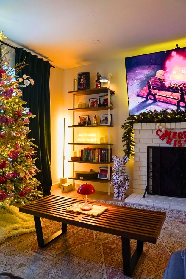 There’s so much to love about parkerthebarker’s space, it’s full of those little details that make Christmas feel magical. The console is the Lois Media Console from Joybird, and the glow you see around the TV comes from Philips Hue bars pointed at the wall for a soft, cozy wash of light.