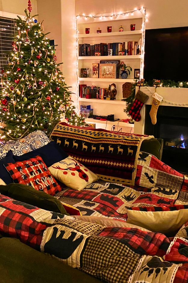 This looks like the kind of setup you’d pin to your Pinterest board right away. u/hasian87 turned their sectional into a “boat bed,” piled it with blankets and buffalo plaid, and suddenly the living room feels like a Christmas campsite.