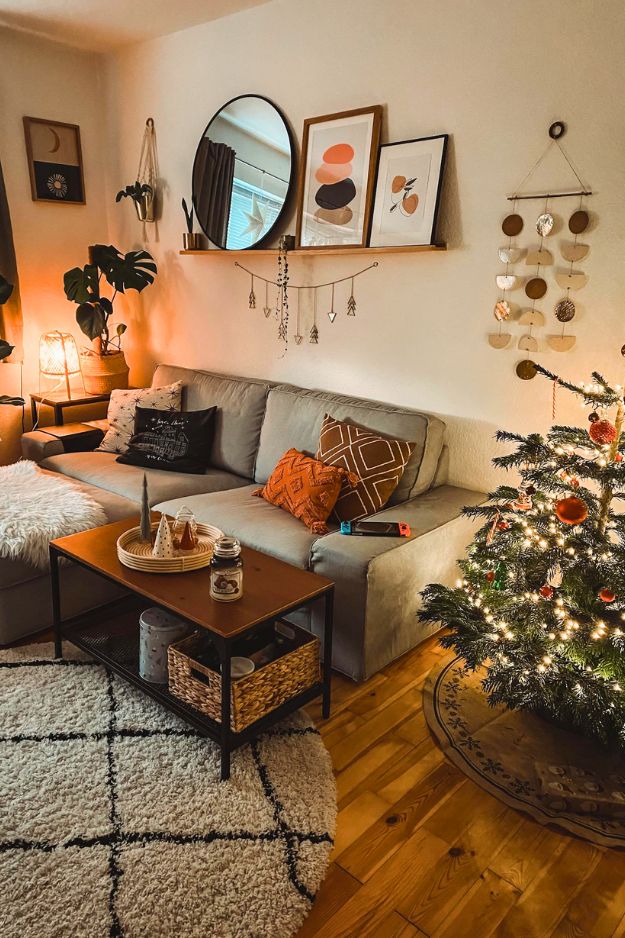 I always thought a big flocked Christmas tree was the dream centerpiece for a holiday apartment, but this space has me rethinking that. The skinny prelit tree tucks in so neatly, adding just the right amount of glow without swallowing the room. And here’s a simple trick worth stealing: hang your curtains a bit higher than the window frame. It draws the eye up, makes the ceiling feel taller.
