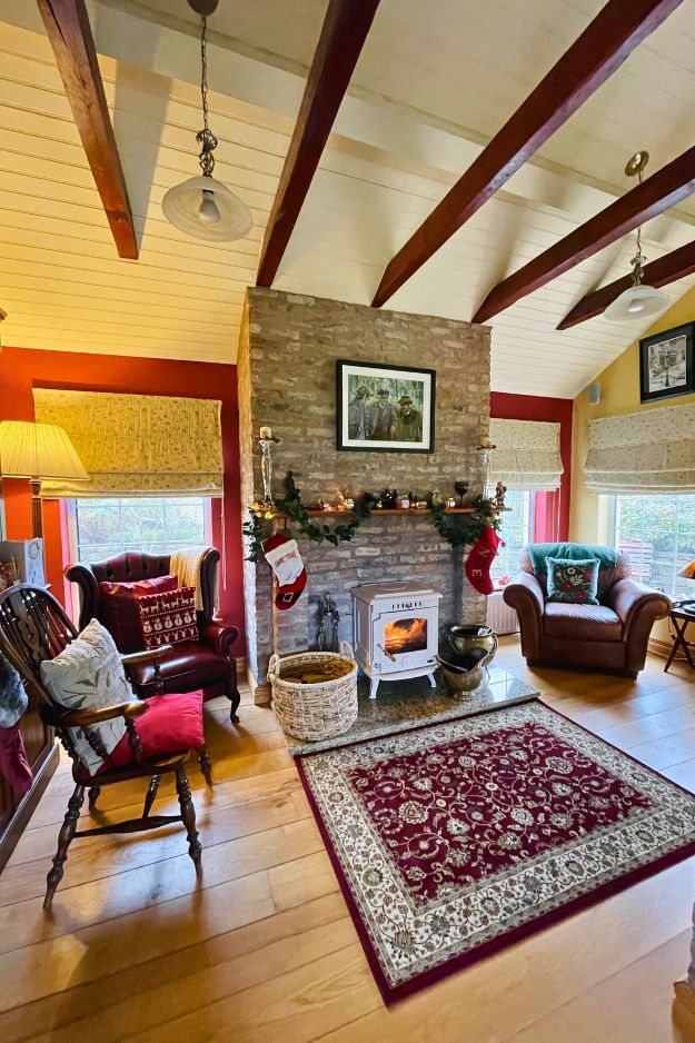 Why do ceiling beams instantly give off that cozy feeling? Maybe it’s the mix of natural wood and structure, but in this Irish home shared by u/mcfaul-, they couldn’t match better with the Christmas decor. The wood-burning stove adds that golden glow, and paired with the rug everyone joked about being in “every Irish house,” it makes the whole room feel timeless.