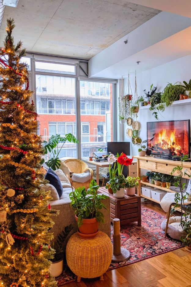 I can’t get over how cozy this urban jungle feels. How do they even manage to take care of them all? Anyway, I’m loving that skinny tree from Michaels and how it blends effortlessly with the plants. With the snow outside the window, it’s basically holiday vibes in a plant lover’s dream. If you’re wondering about what they’re using, the rug’s from Wayfair, TV stand and coffee table from IKEA. With the snow outside the window, it’s basically holiday vibes in a plant lover’s dream.