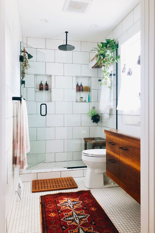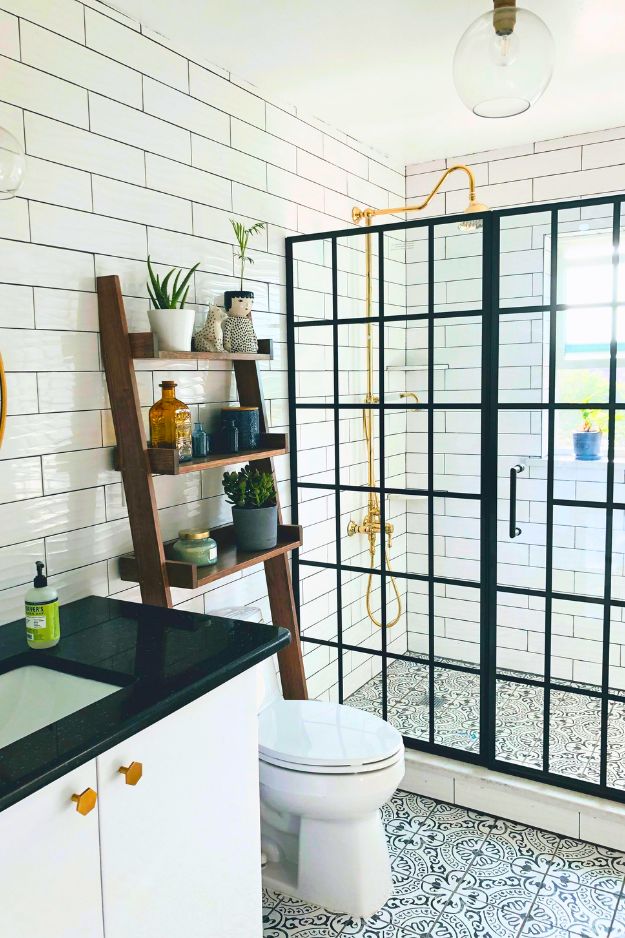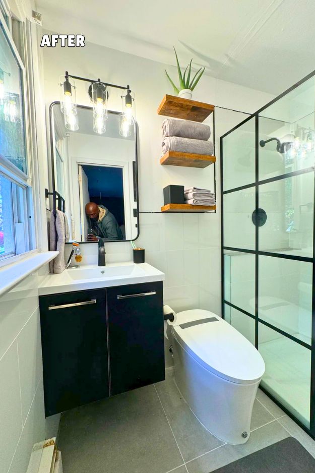 u/idrinkoranges’ DIY bathroom reno is peak black-and-white done right, because it’s crisp without feeling cold. The grid shower door is the obvious main character, it adds that “boutique hotel” structure and somehow makes even classic subway tile feel updated. Then behind the toilet, the ladder-style wood shelves were a genius move people didn’t expect to work, but they totally do, especially with a few plants to soften all that white. Practical note I’d actually steal: tossing a thin waterproof layer under anything on the shelves so humidity doesn’t wreck the wood.
