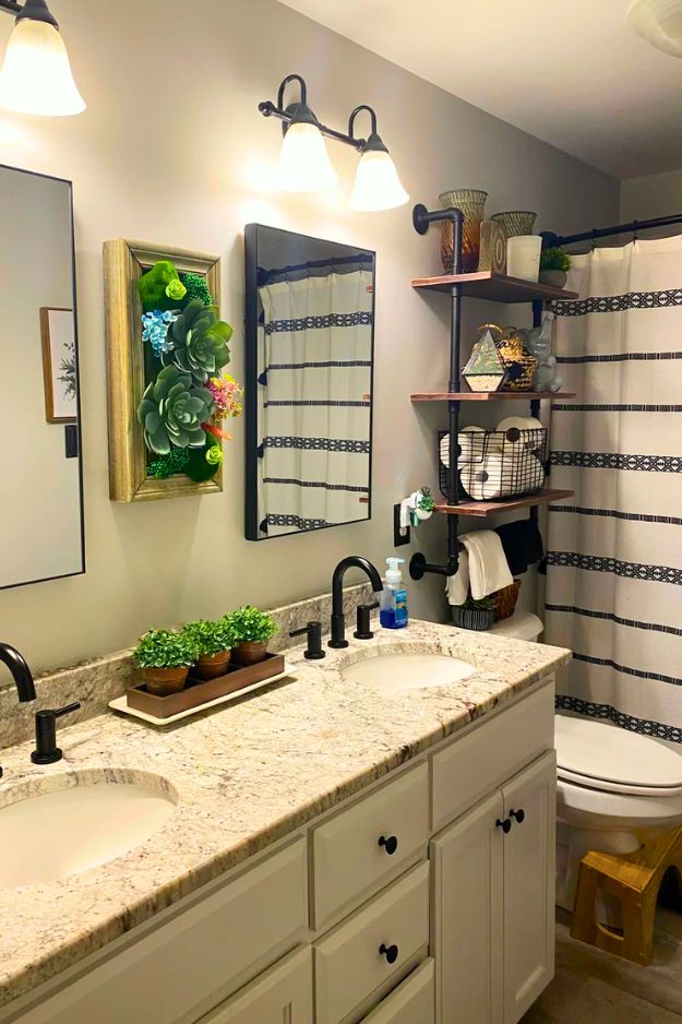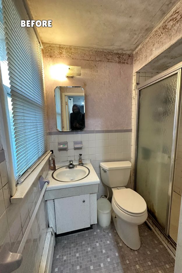 In the “before” pic, that wall above the toilet is basically dead space, just tile + stained upper wall, zero storage, zero style, and the eye goes straight to the ceiling damage and grime.