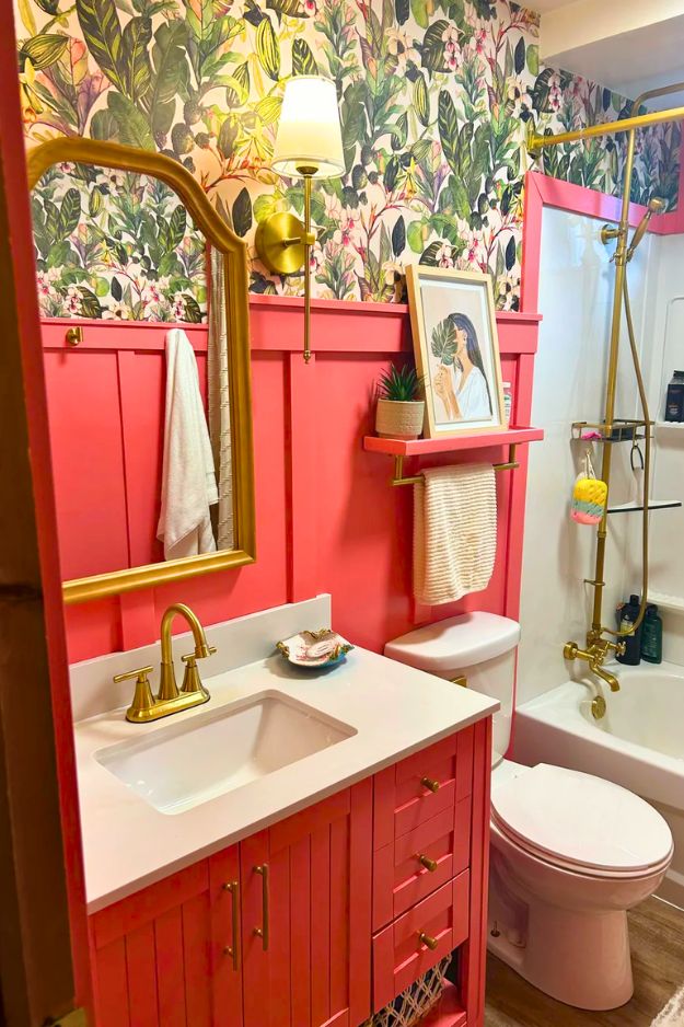 This one is like the definition of “weaponized good taste,” because the whole makeover isn’t just pretty, it’s a statement. The star is that “Fuck You Pink” (Premier Paints Juicy Pink, with Beauti-tone Tickled Pink as a dupe), and I get why it works: it’s bold but still sophisticated when it’s paired with that gorgeous botanical wallpaper and warm, salmon-y tones pulled from it. By Jen_Itals