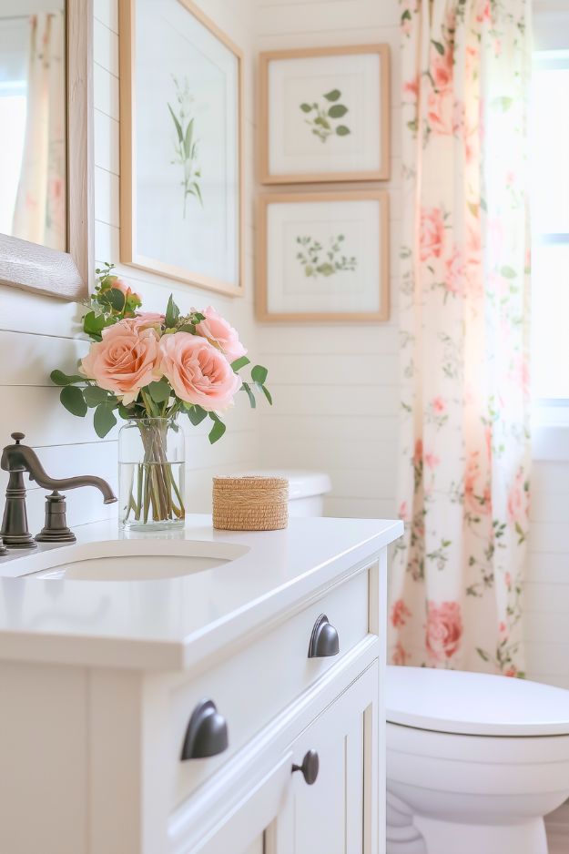 Above the toilet, the decor nails that effortless cottage vibe without feeling overstyled. The two stacked botanical prints in light wood frames add a calm, “clean girl” focal point, and they flow beautifully with the blush floral shower curtain. The whole corner feels bright, airy, and softly romantic, like a tiny spring garden moment in bathroom form. I also love how the simple wall art keeps everything looking elevated, even in a small space. Feminine, fresh, and perfectly uncluttered.