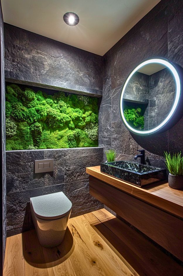 I can’t believe this actually worked. It’s basically “I love terrariums” energy… but makes it architectural and weirdly luxurious. The moss wall looks like a glowing mini jungle shrine above the toilet and I hate how much I love it.