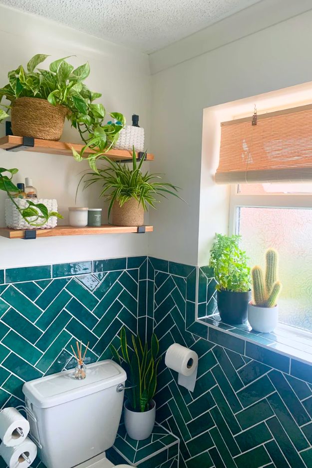 Jessica really said no more sad 90s vibes and went full mini-resort mode with that deep green tile. And somehow it doesn’t make the bathroom feel smaller at all (the white grout and half-wall tile trick is honestly genius). The toilet being moved out of the corner makes the layout feel way more open too… plus it created more room for plants, which is exactly the kind of bathroom logic I support.