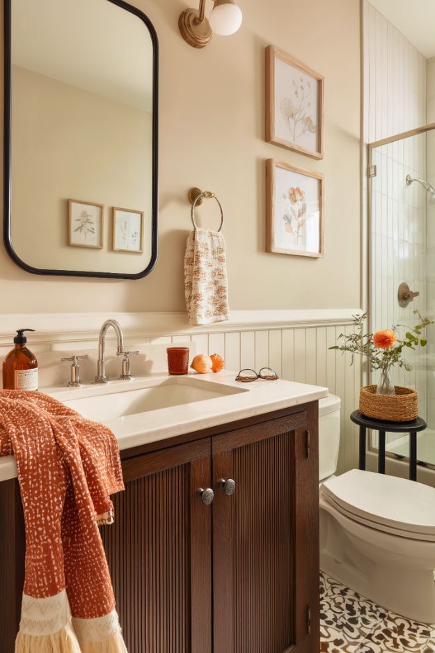 Like… that warm beige wall + soft white beadboard combo is such a quiet flex. And the dark wood vanity? It’s not even trying hard, it just looks expensive by existing. The black framed mirror adds just enough edge so it doesn’t turn into full-on farmhouse cosplay, and those two little framed florals are the kind of simple wall decor that actually works (no clutter, no random “live laugh toilet” energy).
