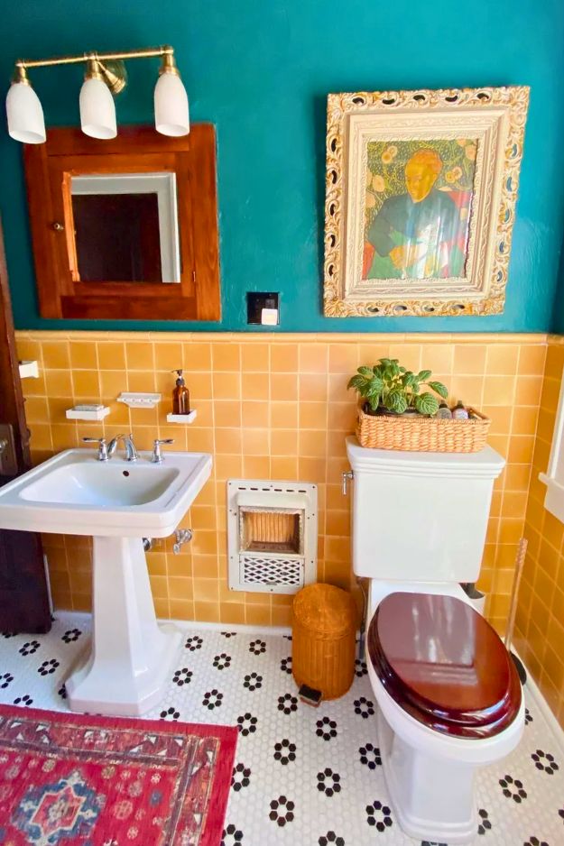I’m sorry but this is the kind of bathroom that would make me take a longer-than-necessary restroom break. They could’ve gone with the usual “two floating shelves” situation… but nope. They fully leaned into character. The vintage gold tile becomes this built-in statement wall. The whole mood is warm, bold, and slightly chaotic in the best way, like an old house that decided to be cool again instead of getting bullied into millennial gray. By toxicshock999