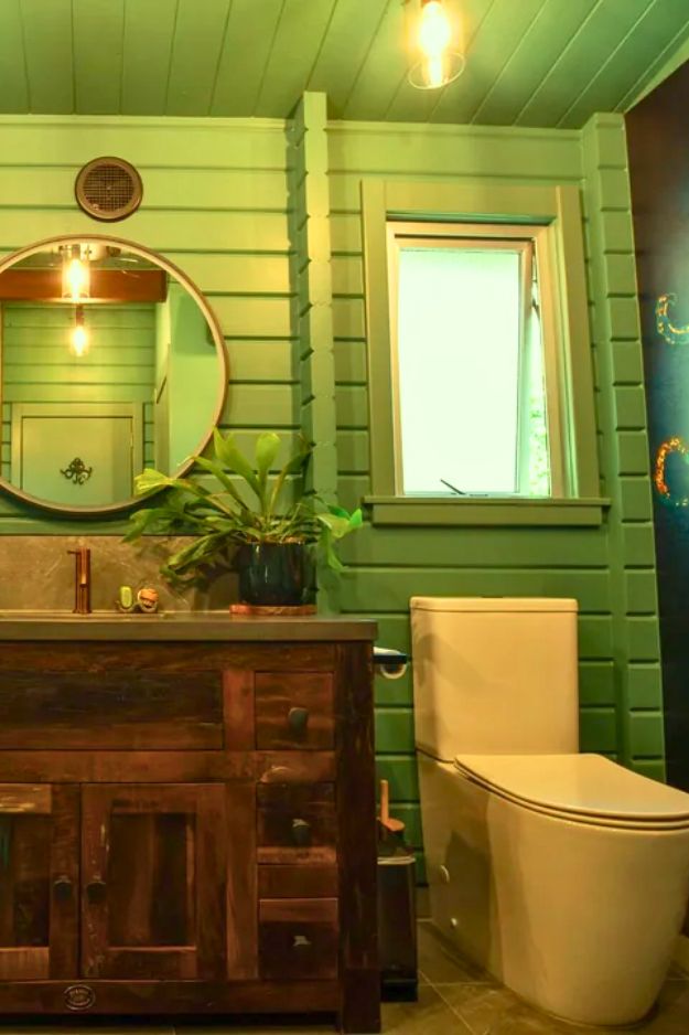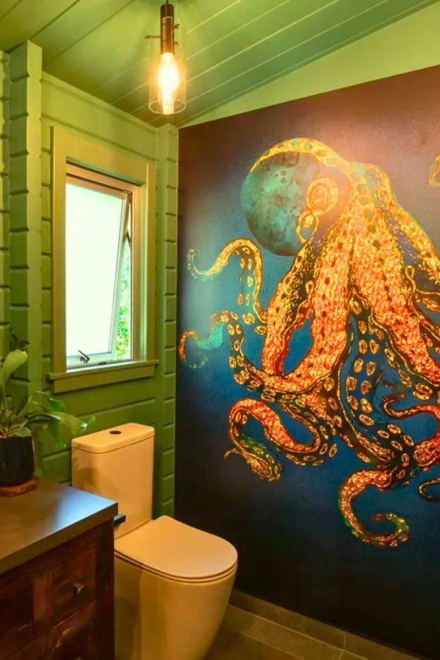 In u/RobDickinson’s bathroom reno, the space above the toilet is honestly such a smart flex. Instead of doing the usual floating shelves, they went with two windows, and it completely changed the vibe. It keeps the room feeling open and breathable, even with the bold green walls and that dramatic octopus moment.