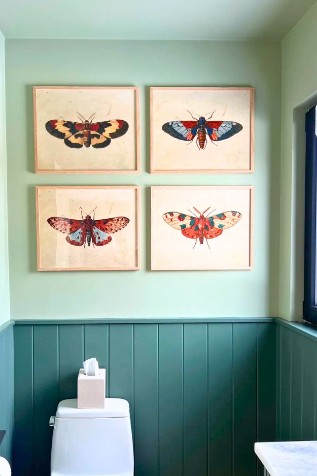 Centering the artwork above the toilet was such a smart move because it instantly makes the wall feel calm and “designed,” not random. And those deep greens (Benjamin Moore Caldwell Green + Saybrook Sage) are bold without being heavy, especially with the ceiling painted too. It’s tidy, elevated, and still has warmth. Credit: u/spellets