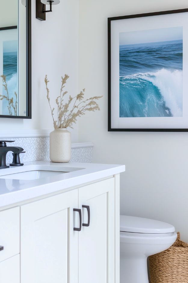 The white vanity + crisp countertop keeps it feeling fresh, while the matte black faucet adds just enough contrast to make it look modern and “finished.” And that large ocean print is honestly the secret sauce here: it brings in calm color and makes the space feel styled without needing shelves or clutter. Even the little vase of dried stems keeps the vibe soft and organic instead of showroom-cold.