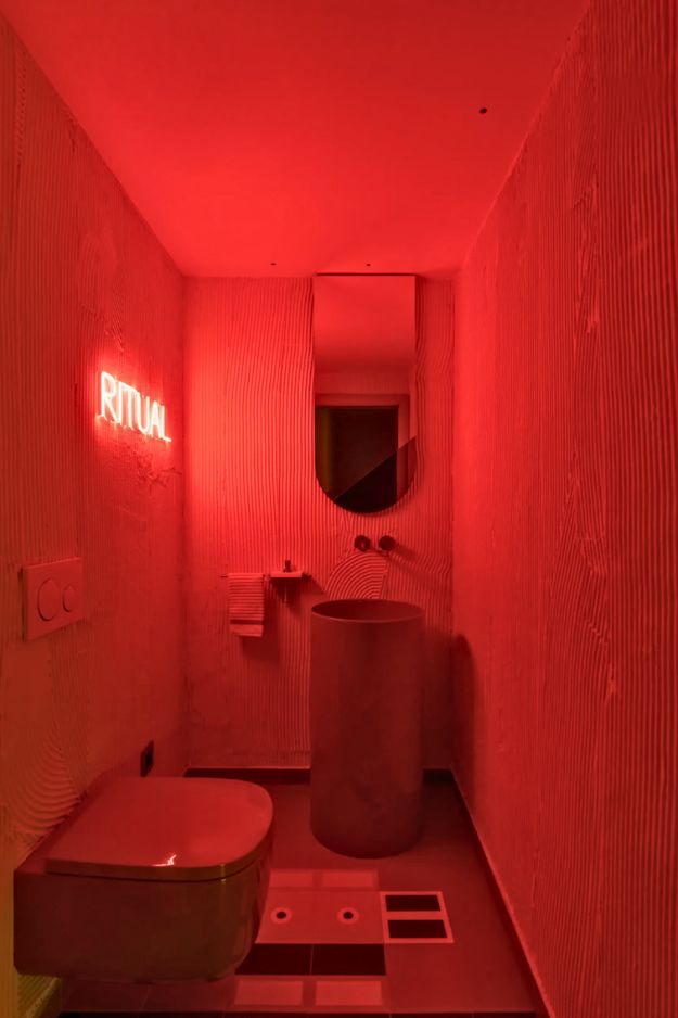 Walking into u/CotaPT’s “Ritual” bathroom feels like stumbling into a cool club restroom in the best way, a little retrofuturist, a little unhinged, and somehow it all clicks. The punchy neon sign plus that bold colored sink and toilet are doing the most, but the real brainy move is the upside-down arched mirror, it’s clever and actually practical for a tight space.