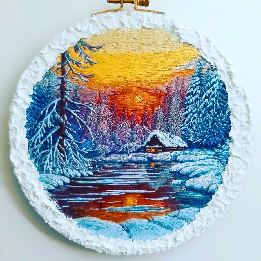 The talent it takes to finish something like this in just two weeks is unreal, and that border completely steals my heart. The snow-paste frame gives the whole landscape this frosted, storybook edge that makes the embroidery feel even more immersive. Paired with the soft shading and peaceful colors, it turns the piece into a tiny window into winter, and I can’t get over how beautifully it all comes together. Amazing work by Tutku_embroidery