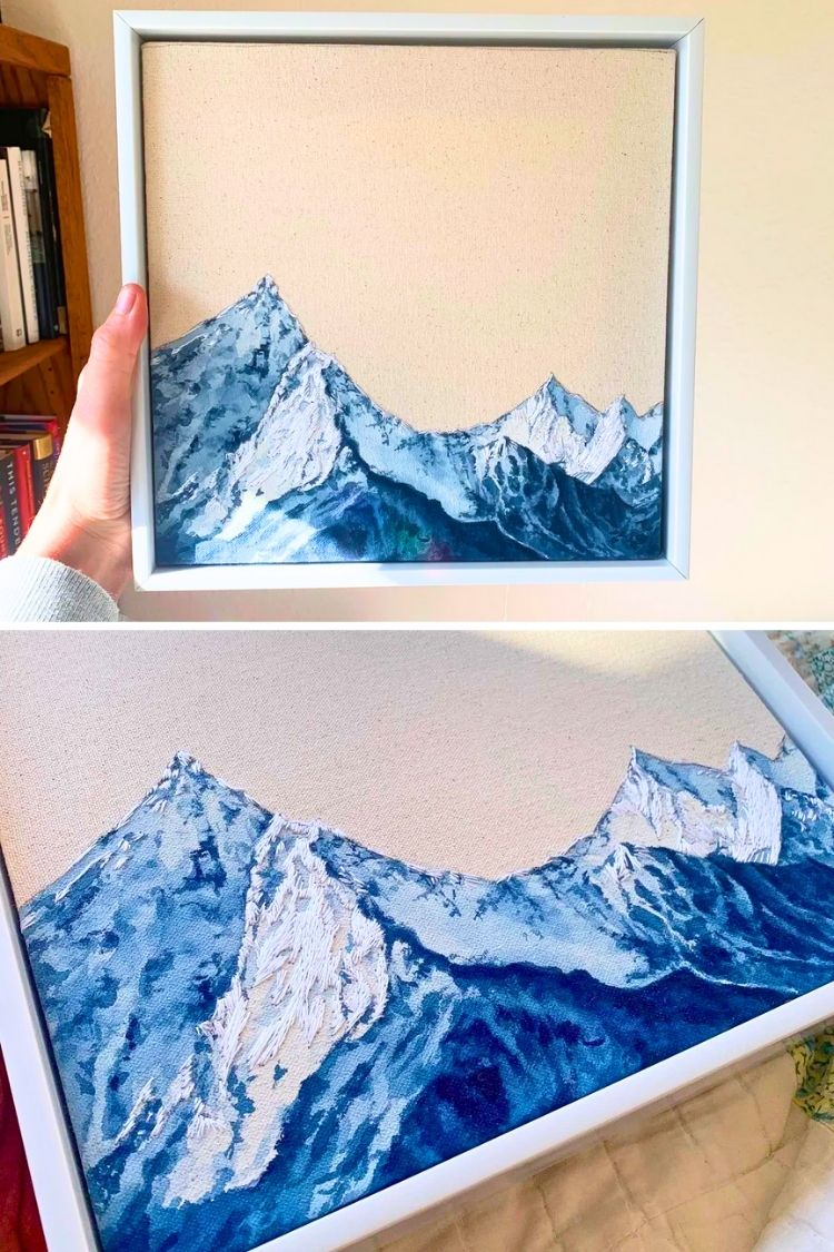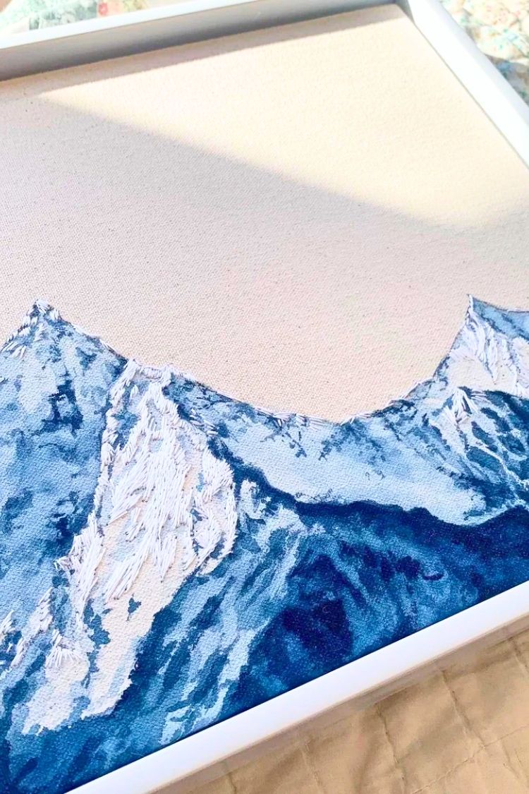 I caught myself staring way too long at this embroidery by charlieismycat just to take in all the tiny details. The blend of watercolor and embroidery is so seamless that the snowy peaks almost glow, and that shiny DMC white thread really does look like sunlight bouncing off real mountains.