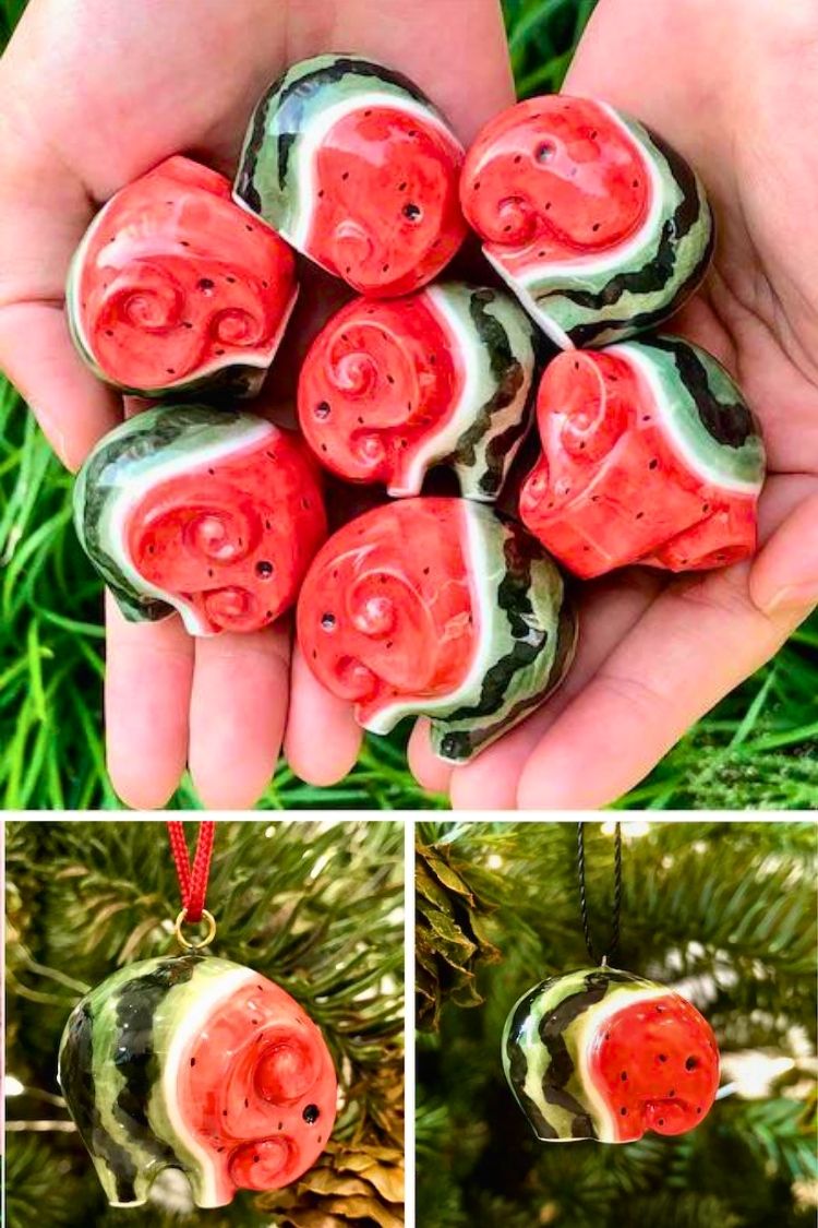Watermelon and elephant are definitely not the first things I’d ever associate with winter or Christmas decor, and maybe that’s why these ornaments hit so hard. They’re unexpected in the sweetest way, like someone took a summer day and whispered it into a tiny ceramic creature. It’s one of those ideas that shouldn’t work on paper but totally does once you see it, and it adds this fun, whimsical energy that most holiday decor never even tries for. Credit goes to Hannahporcelain