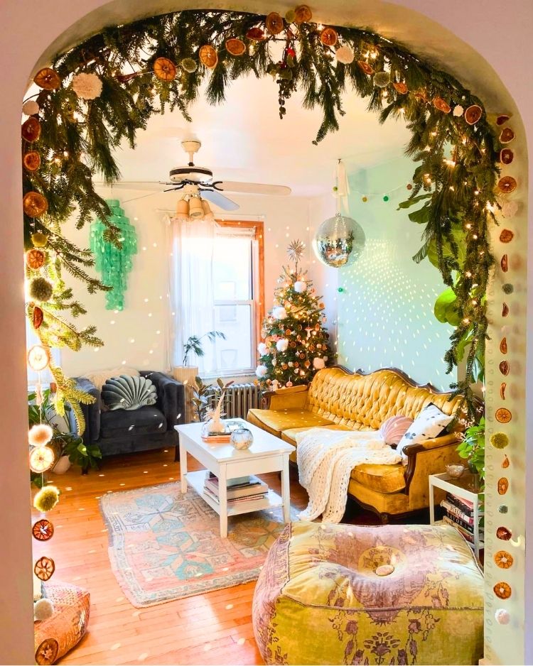 That hanging wreath is the first thing that caught my eye, and it pulls the whole corner together in such a soft, effortless way. Paired with the citrus garland, the twinkly lights and that unapologetically fun disco ball, the space lands in this sweet spot between cozy and quirky. It feels like the kind of room where you’d curl up on the couch and forget you had errands to run.