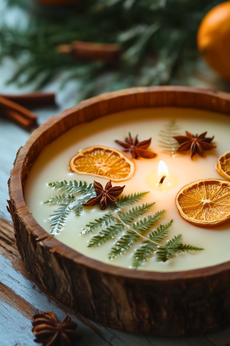 I love a good DIY candle, and seeing this one makes me want to drag my supplies back out because it really is pretty fun once you get into it. The dried oranges, star anise, and those little fern sprigs floating in the wax give it such a cozy, handmade vibe. It feels like the kind of project where you light it later and think, yep, totally worth the mess.