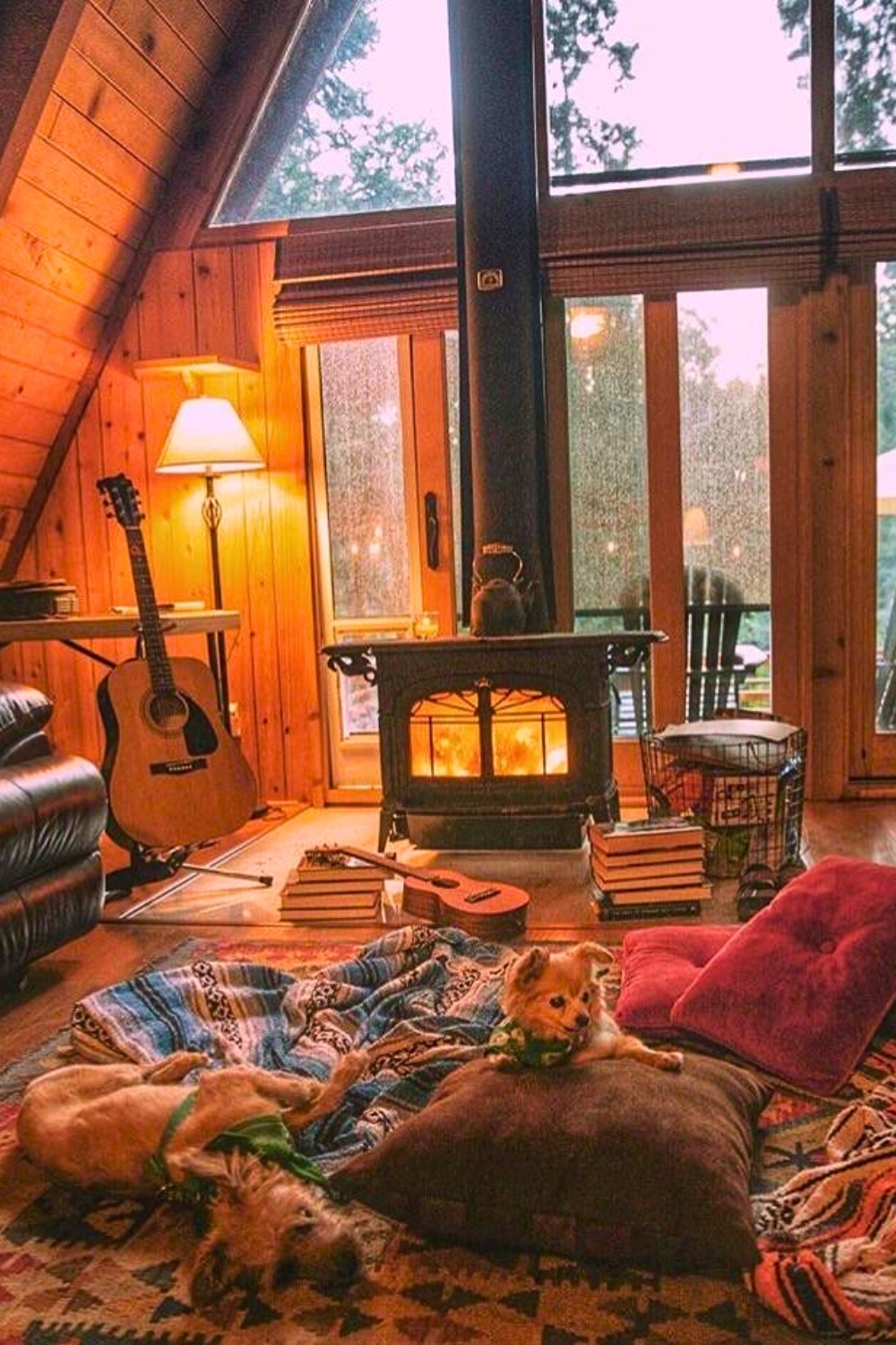 Moving downstairs, I’m instantly drawn to this A-frame reading nook because it has a fireplace and those rain-soaked windows we all love. It’s the ultimate mountain-style interior, especially with those relaxed dogs creating that cozy winter comfort. I love how u/visualslikemike kept it feeling real with books on the floor and instruments nearby, showing off a rustic design that doesn’t feel staged at all. I can totally see myself reading by that fire and just forgetting the rest of the world exists.