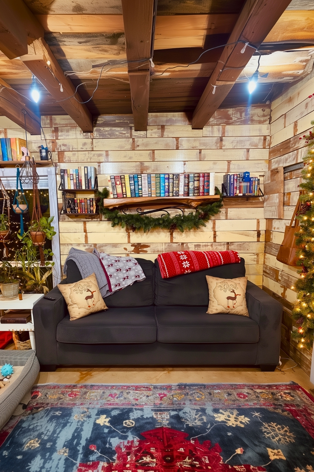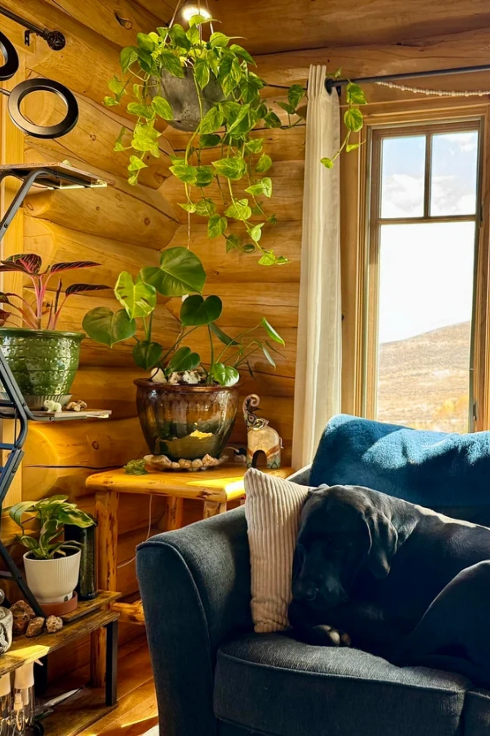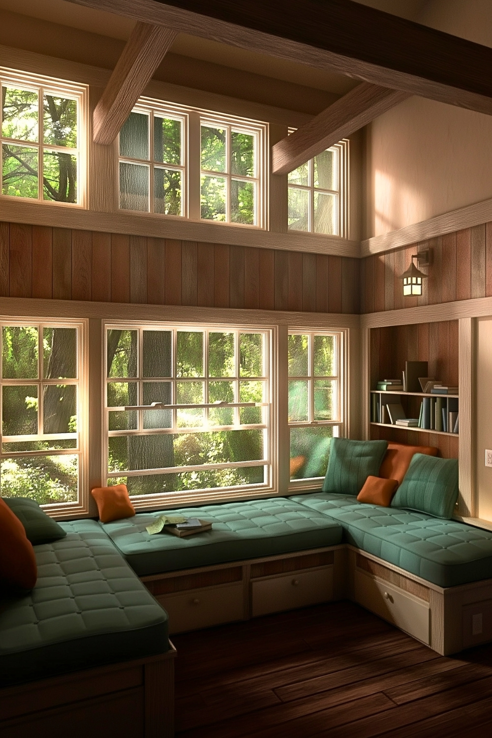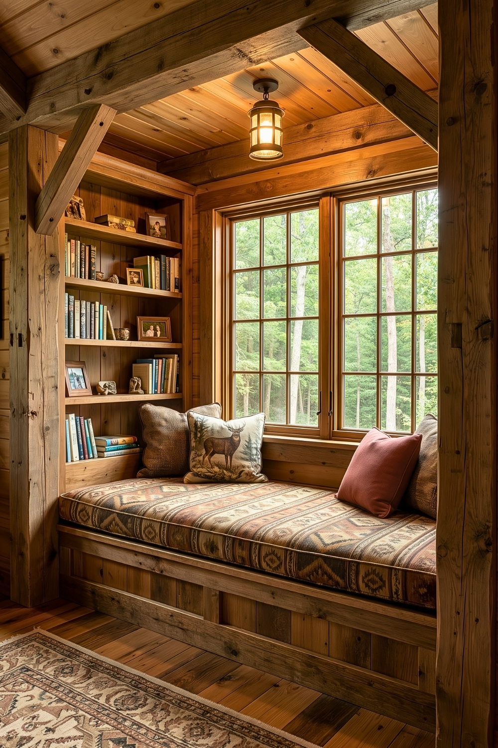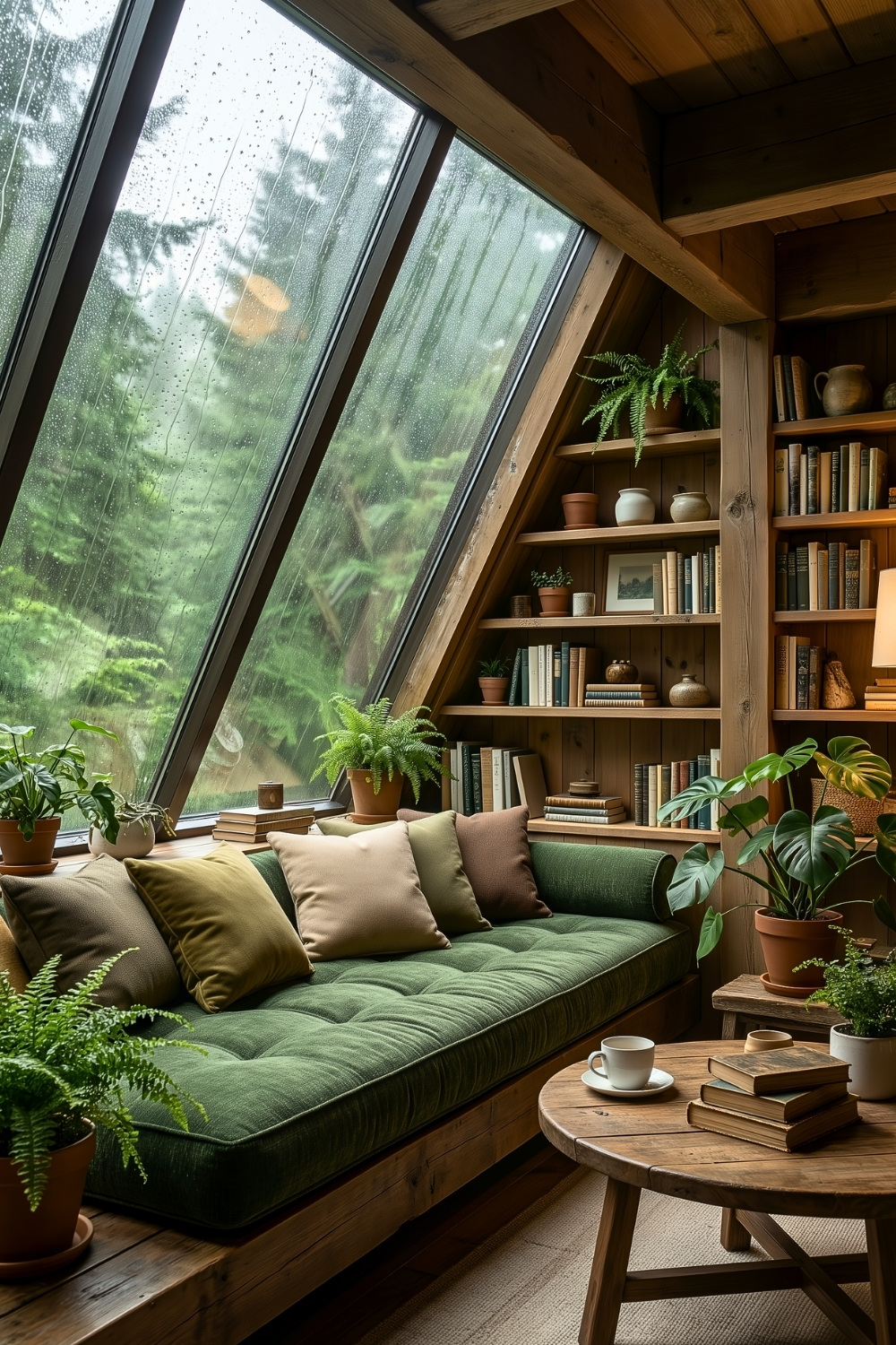 What I really appreciate about this reading nook is how calm it feels without relying on darkness or heavy layers. The green cushions, indoor plants, and large slanted window bring a softer take on rustic cabin interior design, especially for anyone who loves natural light while they read. It feels like a mountain-style idea made for slow mornings, where the view and the quiet do half the work for you.