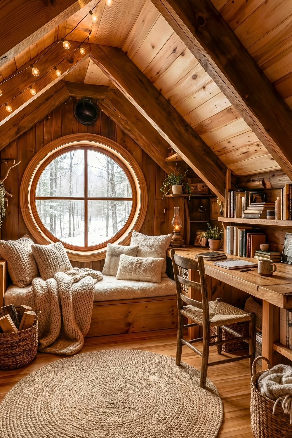 What really caught my eye next was how a mountain-style loft can feel both playful and peaceful at the same time. The sloped wood ceiling and round window create a cozy sense of enclosure that makes reading feel more intentional, almost like a retreat from the rest of the cabin. I’d imagine this being perfect in winter, when the light is soft and the world outside feels far away.