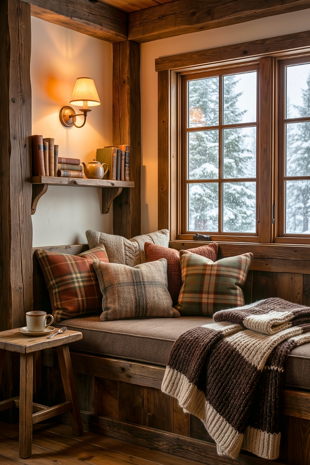 This nook immediately makes me think about slow winter afternoons spent by the window with snow falling outside. The plaid pillows, layered knits, and warm wall lighting create a rustic cabin interior that feels incredibly inviting without feeling overstyled. I love how this window seat solves the need for a dedicated reading spot while still keeping the space open, bright, and connected to the mountain scenery.