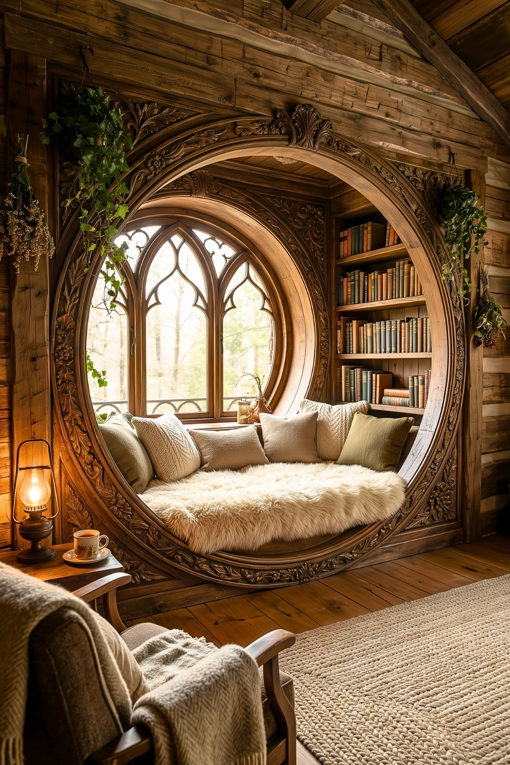 This next nook feels like it belongs in a storybook, and I mean that in the best way. The ornate circular window seat adds so much character to the rustic interior design, proving that reading spaces don’t have to be plain to be comfortable.