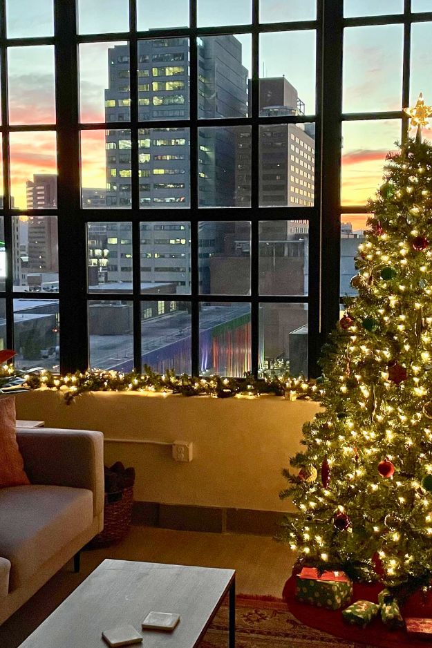 I like how this cozy living room pulls the whole Christmas scene together with just a few touches, like the tree glowing softly, that big city window acting like a backdrop, and even a simple Target lamp adding to the warmth. The wood floors and cozy sofa make the space feel grounded, but it’s really the skyline through the glass that makes the room feel magical, almost like the city itself is part of the holiday décor.