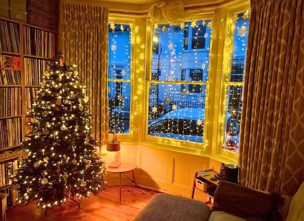 eternal__scout’s mum’s living room is at peak cozy Christmas vibes. The tree is glowing, George Michael’s up there as the topper, and the whole space just feels fun and inviting. What I really love is how the shelves of books and records make it feel lived-in, and the window lights that make you wanna curl up and never leave. Here’s the diy instruction: layering different strands of lights (vertical LEDs, horizontal star lights, and dangling snowflakes) to create a magical effect